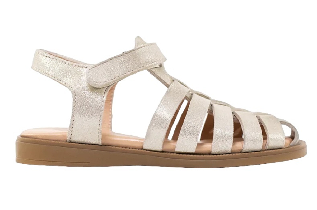 Sandale/nu-pieds à lanières en cuir métallisé pour fille, et semelle intérieure gravée de motifs coquillages, avec semelle en caoutchouc et fermeture velcro sur la cheville et la tige pour un meilleur maintien et une plus grande facilité d'enfilage.